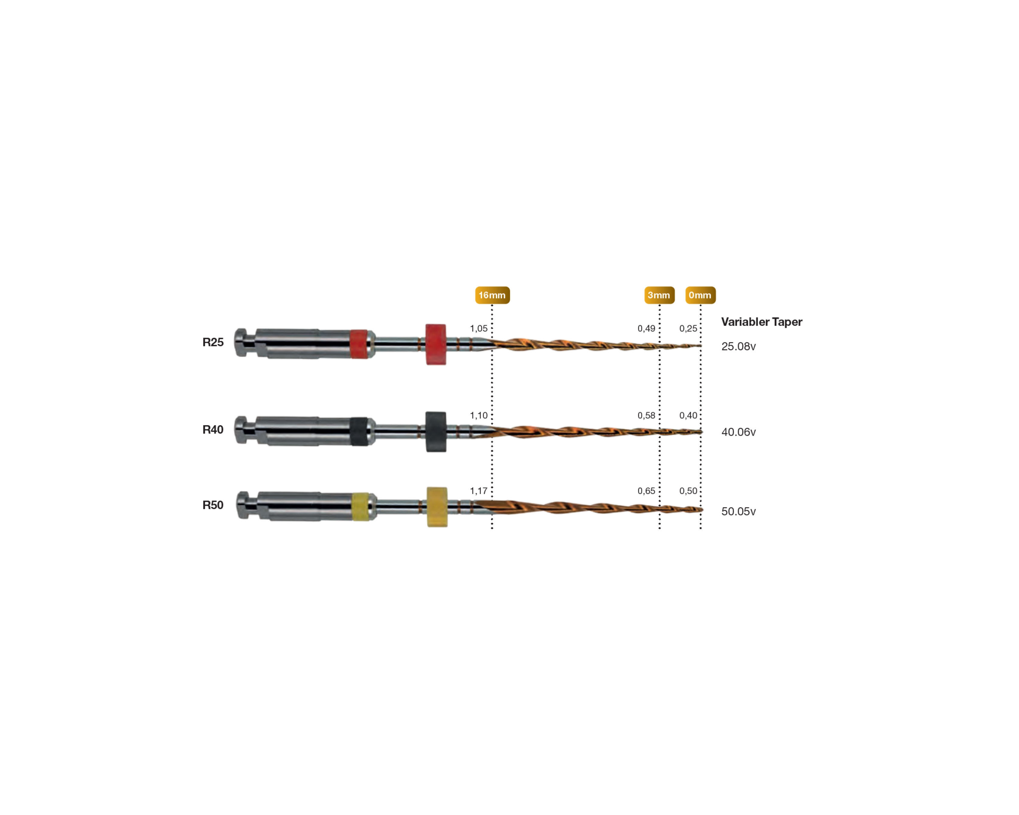 R25 bereitet den Wurzelkanal über die ersten apikalen Millimeter mit Taper .08 auf einen Durchmesser von 0,25 mm auf.